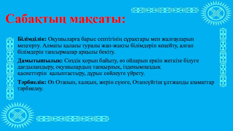 Сабақтың мақсаты:Білімділік: Оқушыларға барыс септігінің сұрақтары мен жалғауларын меңгерту. Алматы қаласы туралы жан-жақты білімдерін кеңейту, алған білімдерін