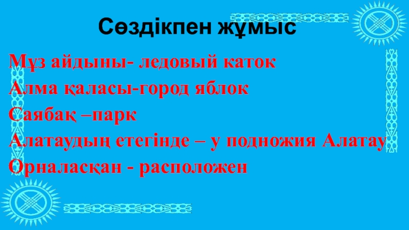 Сөздікпен жұмысМұз айдыны- ледовый катокАлма қаласы-город яблокСаябақ –паркАлатаудың етегінде – у подножия АлатауОрналасқан - расположен