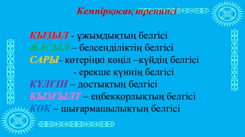 Кемпірқосақ тренингіҚЫЗЫЛ - ұжымдықтың белгісіЖАСЫЛ – белсенділіктің белгісіСАРЫ- көтеріңкі көңіл –күйдің белгісіКӨКШІЛ- ерекше күннің белгісіКҮЛГІН – достықтың белгісіҚЫЗҒЫЛТ – еңбекқорлықтың белгісіКӨК – шығармашылықтың белгісі
