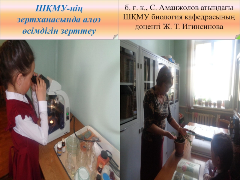 Слайд 23ШҚМУ-нің зертханасында алоэ өсімдігін зерттеу