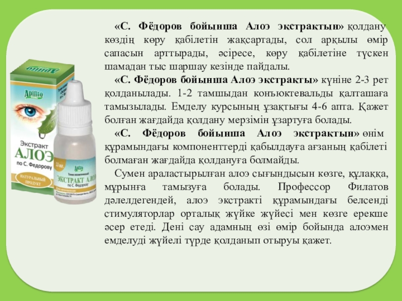 Слайд 28«С. Фёдоров бойынша Алоэ экстрактын» қолдану көздің көру қабілетін жақсартады, сол арқылы