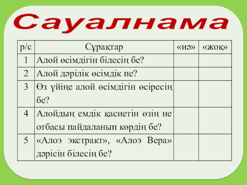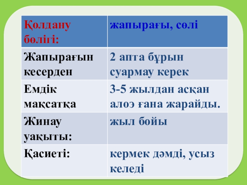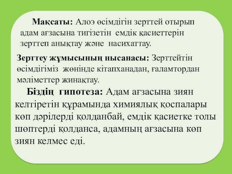 Слайд 4Мақсаты: Алоэ өсімдігін зерттей отырып адам ағзасына тигізетін емдік қасиеттерін зерттеп