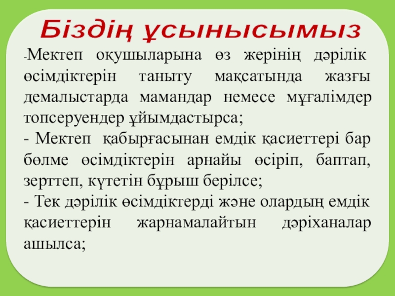 Слайд 35-Мектеп оқушыларына өз жерінің дәрілік өсімдіктерін таныту мақсатында жазғы демалыстарда мамандар