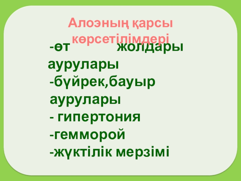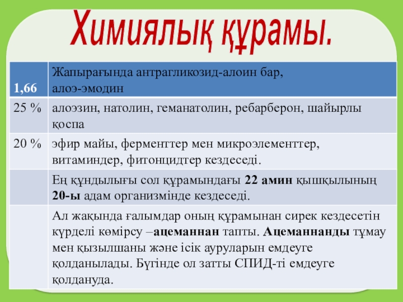 -Алоэ өсімдігінін емдік ерекшеліктеріне жан – жақты сипаттама берілді;