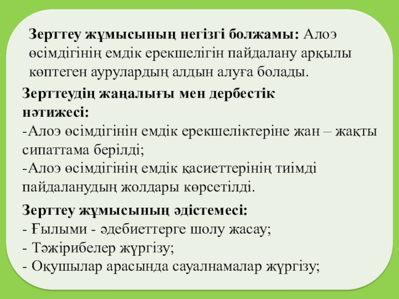 Біздің бұл ғылыми жұмыста Қазақстанда кездесетін дәрілік өсімдіктердің біразына: алоэ,