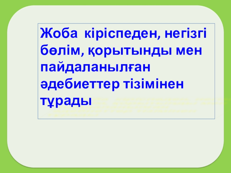 Слайд 6Жоба кіріспеден, негізгі бөлім, қорытынды мен пайдаланылған әдебиеттер тізімінен тұрады