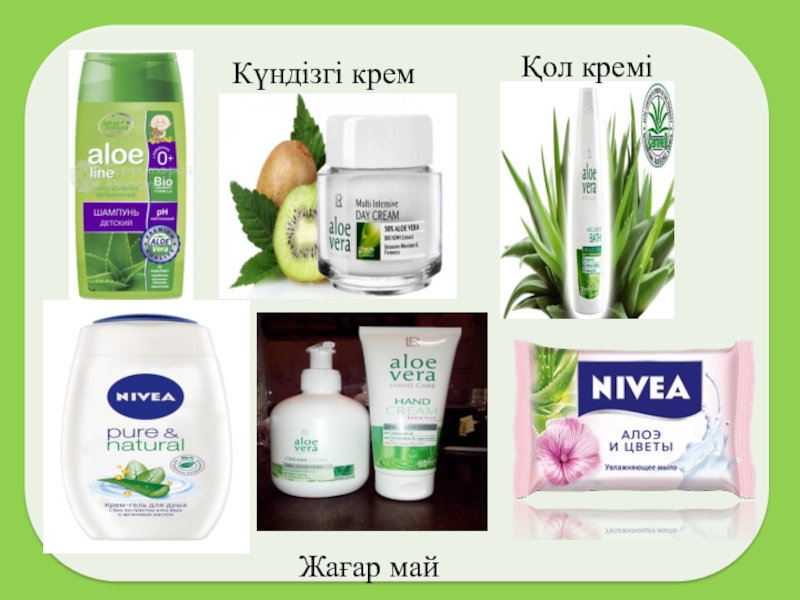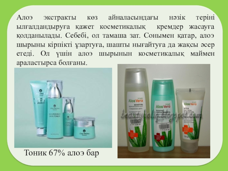 Слайд 29Алоэ экстракты көз айналасындағы нәзік теріні ылғалдандыруға қажет косметикалық кремдер жасауға