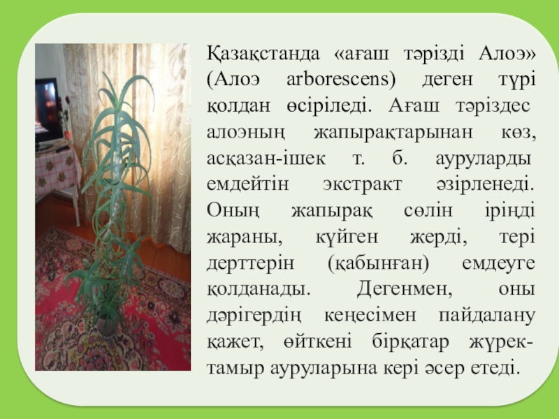 Слайд 11Қазақстанда «ағаш тәрізді Алоэ» (Алоэ arborescens) деген түрі қолдан өсіріледі. Ағаш
