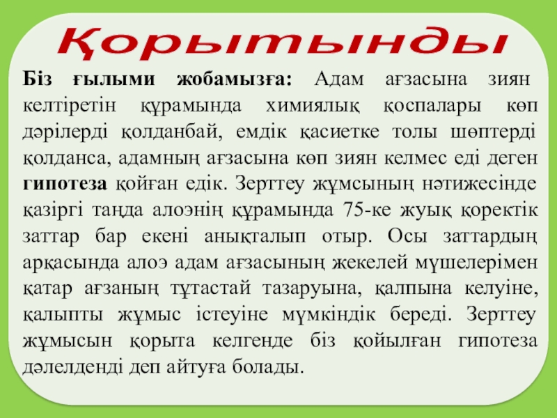 дәрілерді қолданбай, емдік қасиетке толы шөптерді қолданса, адамның ағзасына көп зиян келмес еді деген гипотеза қойған едік. Зерттеу жұмсының нәтижесінде қазіргі таңда алоэнің құрамында 75-ке жуық қоректік заттар бар екені анықталып отыр. Осы заттардың арқасында алоэ адам ағзасының жекелей мүшелерімен қатар ағзаның тұтастай тазаруына, қалпына келуіне, қалыпты жұмыс істеуіне мүмкіндік береді. Зерттеу жұмысын қорыта келгенде біз қойылған гипотеза дәлелденді деп айтуға болады.