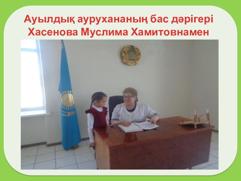 Слайд 22Ауылдық аурухананың бас дәрігері Хасенова Муслима Хамитовнамен кездесу