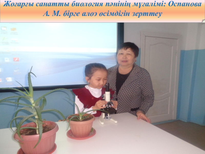 Слайд 15Жоғарғы санатты биология пәнінің мұғалімі: Оспанова А. М. бірге алоэ өсімдігін