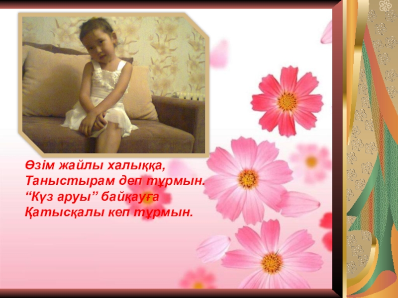 Слайд 1Өзім жайлы халыққа, Таныстырам деп тұрмын. “Күз аруы” байқауға Қатысқалы кеп тұрмын.