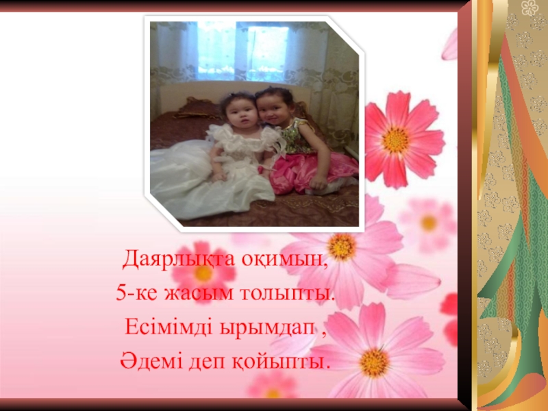 Даярлықта оқимын,5-ке жасым толыпты.Есімімді ырымдап ,Әдемі деп қойыпты.