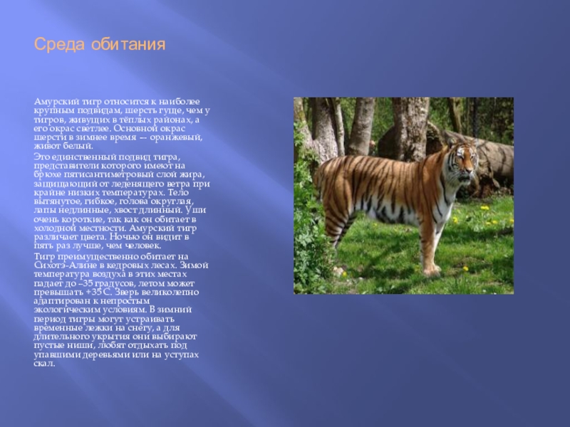 шести других подвидов самыми крупными размерами. Вес взрослых самцов может достигать 300 кг, длина тела от 1,5 до 3 м. Тигр имеет окраску яркого цвета, шерсть у него длинная и густая, мощное и гибкое тело, красивая большая голова, сильные лапы с упругими подушечками, позволяющими зверю бесшумно подкрадываться к добыче. Он – единственный подвид, который приспособился жить в суровых зимних условиях, в глубоком снегу. Амурские тигры сейчас обитают на обширных таежных просторах Приморья, на юге Хабаровского края.