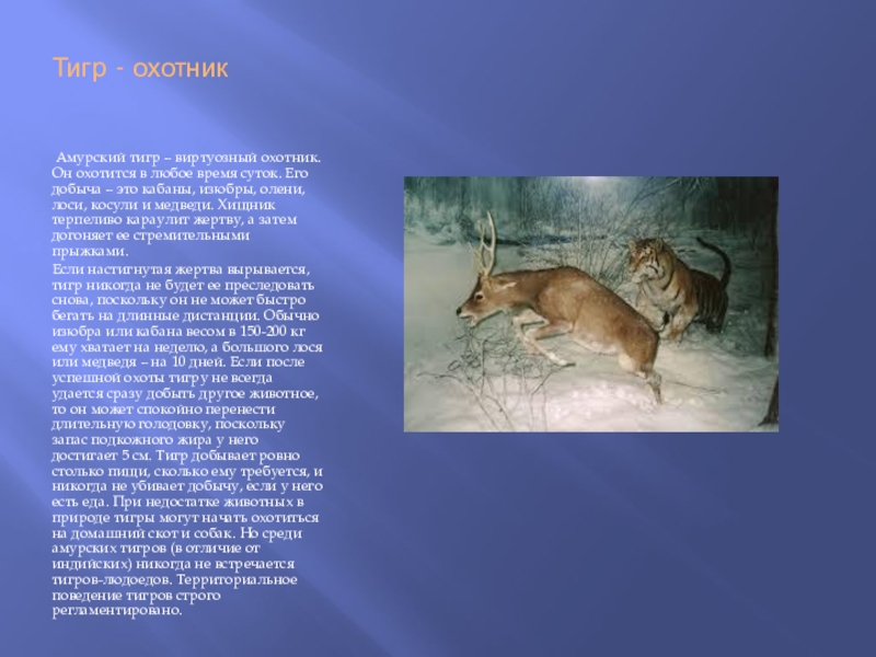 Если настигнутая жертва вырывается, тигр никогда не будет ее преследовать снова, поскольку он не может быстро бегать на длинные дистанции. Обычно изюбра или кабана весом в 150-200 кг ему хватает на неделю, а большого лося или медведя – на 10 дней. Если после успешной охоты тигру не всегда удается сразу добыть другое животное, то он может спокойно перенести длительную голодовку, поскольку запас подкожного жира у него достигает 5 см. Тигр добывает ровно столько пищи, сколько ему требуется, и никогда не убивает добычу, если у него есть еда. При недостатке животных в природе тигры могут начать охотиться на домашний скот и собак. Но среди амурских тигров (в отличие от индийских) никогда не встречается тигров-людоедов. Территориальное поведение тигров строго регламентировано.