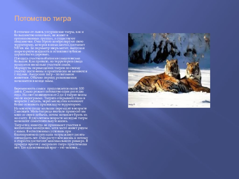 Тигр-отец никогда не принимает участия в воспитании молодняка, хотя часто живет рядом с ними. В естественных условиях при благоприятной ситуации тигры живут десять-пятнадцать лет. Они растут всю жизнь и потому к старости достигают максимального размера. В природе врагов у амурского тигра практически нет. Его единственный враг – это человек…