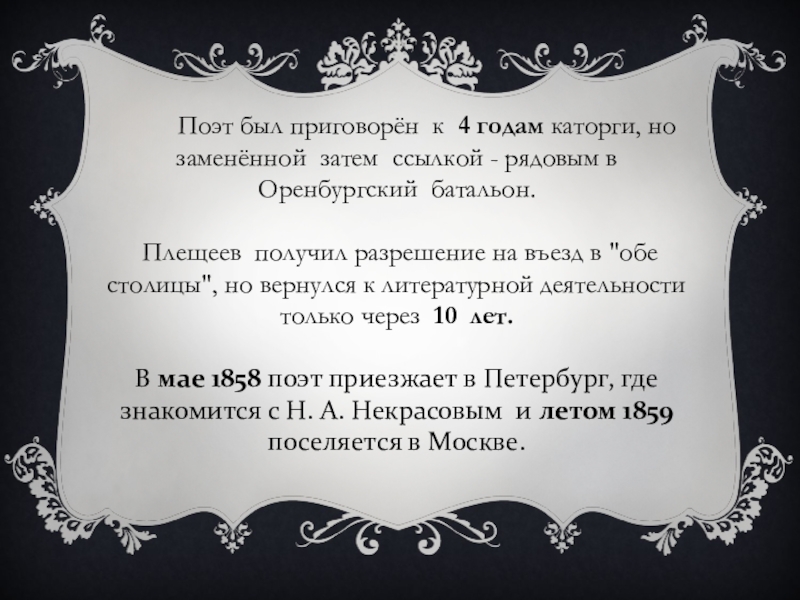 Плещеев получил разрешение на въезд в "обе столицы", но вернулся к литературной деятельности только через 10 лет.