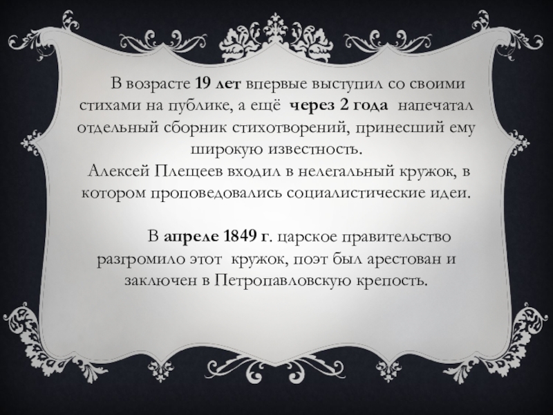 В апреле 1849 г. царское правительство разгромило этот кружок, поэт был арестован и заключен в Петропавловскую крепость.