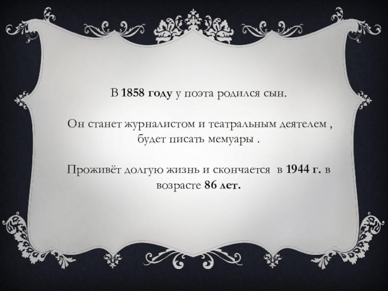 В 1858 году у поэта родился сын. Он станет журналистом и театральным деятелем , будет
