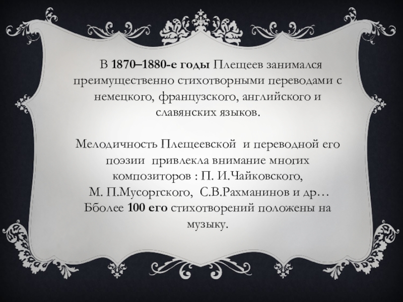 В 1870–1880-е годы Плещеев занимался преимущественно стихотворными переводами с немецкого, французского, английского и славянских языков.Мелодичность Плещеевской