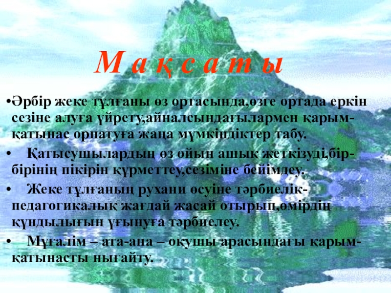 М а қ с а т ыӘрбір жеке тұлғаны өз ортасында,өзге ортада еркін сезіне алуға үйрету,айналсындағылармен қарым-қатынас орнатуға жаңа мүмкіндіктер табу. Қатысушылардың өз ойын ашық жеткізуді,бір-бірінің пікірін құрметтеу,сезіміне бейімдеу. Жеке тұлғаның рухани өсуіне тәрбиелік-педагогикалық