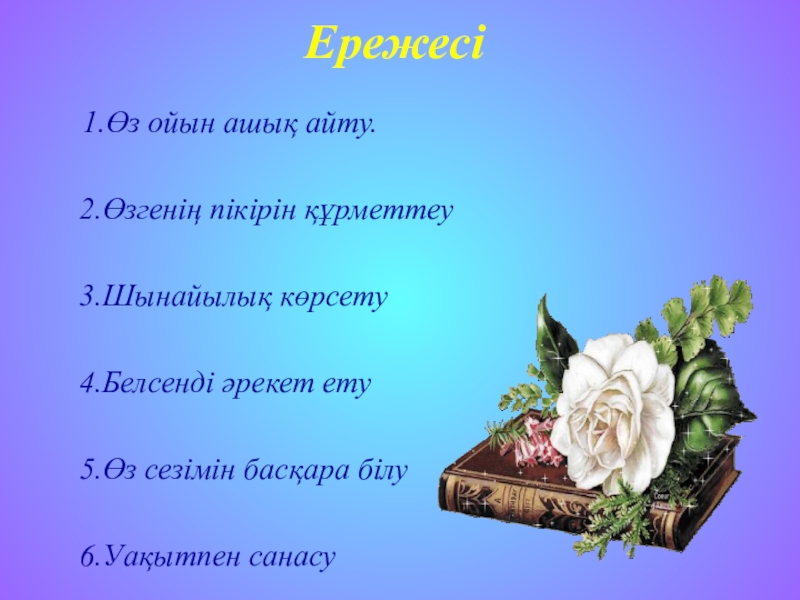 Ережесі  1.Өз ойын ашық айту.  2.Өзгенің пікірін құрметтеу  3.Шынайылық көрсету  4.Белсенді әрекет ету