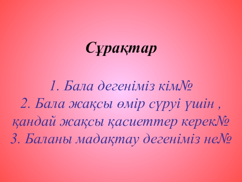 Сұрақтар  1. Бала дегеніміз кім№ 2. Бала жақсы өмір сүруі үшін , қандай жақсы қасиеттер керек№