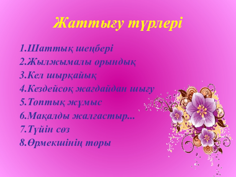 Жаттығу түрлері 1.Шаттық шеңбері 2.Жылжымалы орындық 3.Кел шырқайық 4.Кездейсоқ жағдайдан шығу 5.Топтық жұмыс 6.Мақалды жалғастыр... 7.Түйін сөз