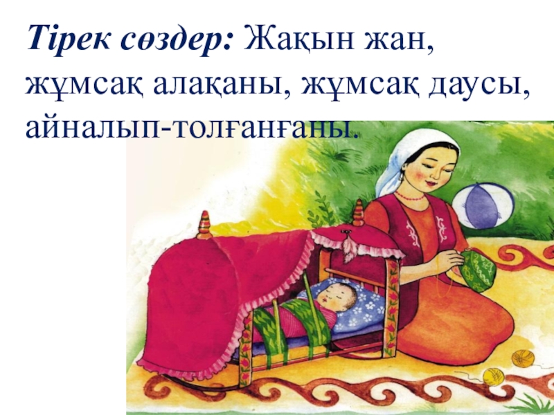 Слайд 18Тірек сөздер: Жақын жан, жұмсақ алақаны, жұмсақ даусы, айналып-толғанғаны.