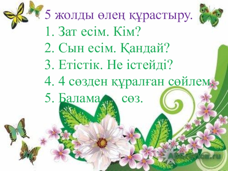 5 жолды өлең құрастыру.1. Зат есім. Кім?2. Сын есім. Қандай?3. Етістік. Не істейді?4. 4 сөзден құралған сөйлем.5.