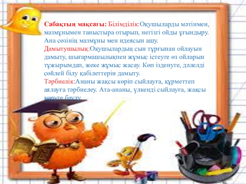 Слайд 2Сабақтың мақсаты: Білімділік:Оқушыларды мәтінмен, мазмұнымен таныстыра отырып, негізгі ойды ұғындыру. Ана
