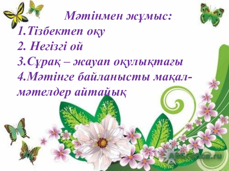 Мәтінмен жұмыс:1.Тізбектеп оқу2. Негізгі ой3.Сұрақ – жауап оқулықтағы4.Мәтінге байланысты мақал-мәтелдер айтайық