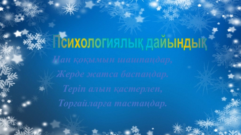Нан қоқымын шашпаңдар,Жерде жатса баспаңдар.Теріп алып қастерлеп,Торғайларға тастаңдар. Психологиялық дайындық