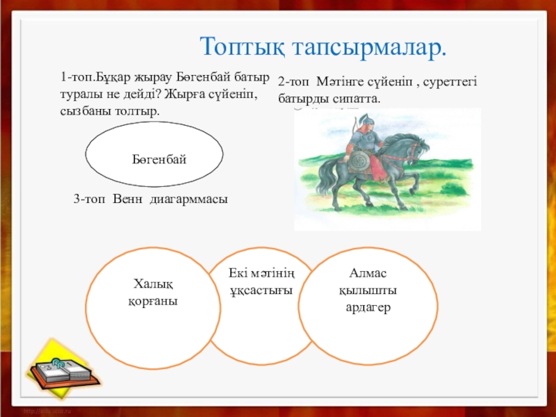 2-топ Мәтінге сүйеніп , суреттегі батырды сипатта.
