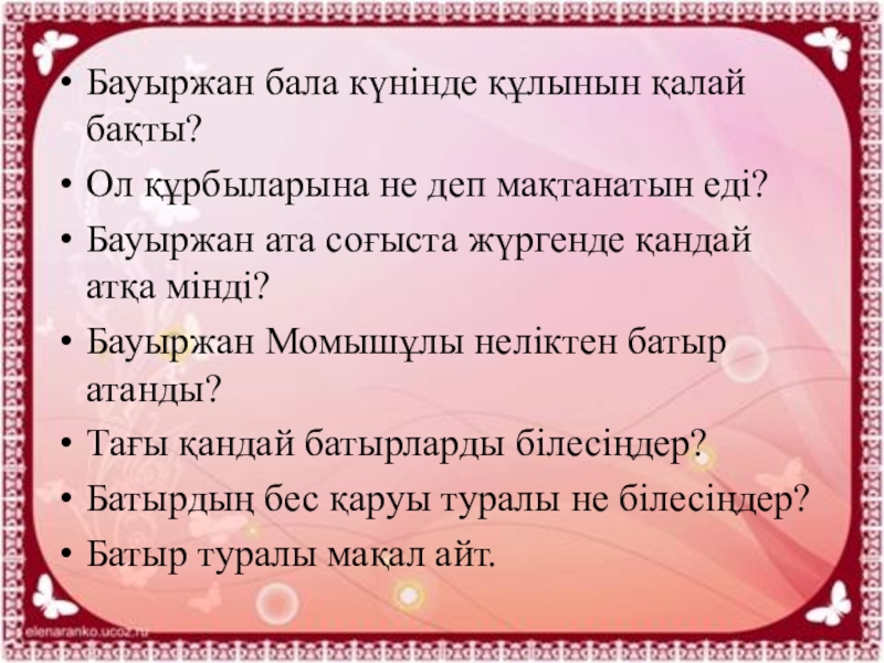 Бауыржан бала күнінде құлынын қалай бақты?Ол құрбыларына не деп мақтанатын еді?Бауыржан ата соғыста жүргенде қандай атқа мінді?Бауыржан