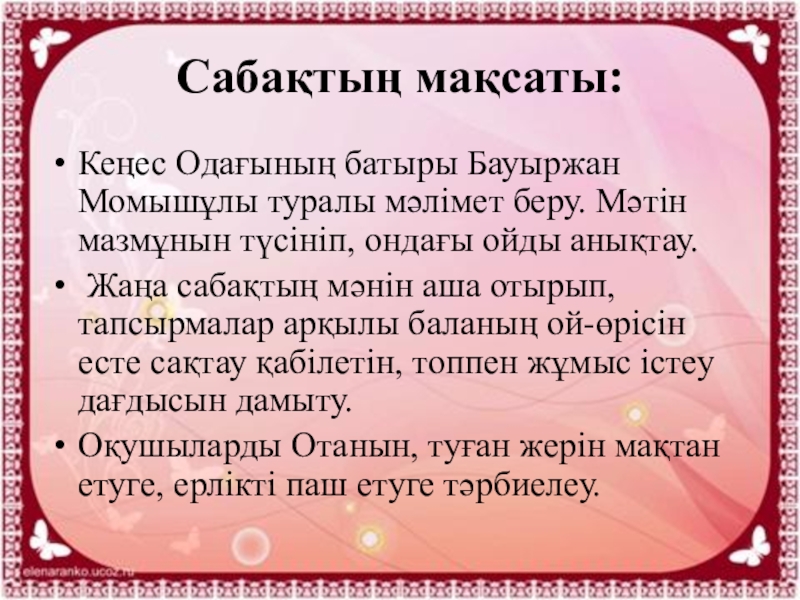 Сабақтың мақсаты:Кеңес Одағының батыры Бауыржан Момышұлы туралы мәлімет беру. Мәтін мазмұнын түсініп, ондағы ойды анықтау. Жаңа сабақтың мәнін аша