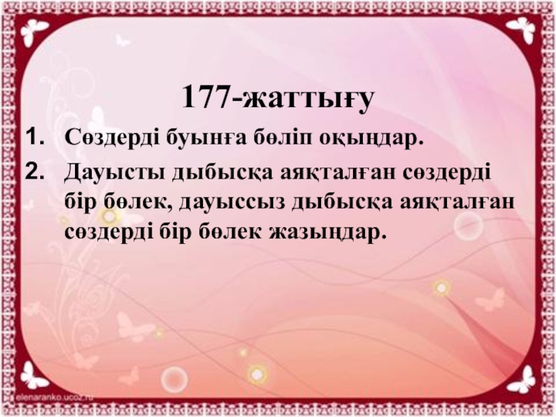 177-жаттығуСөздерді буынға бөліп оқыңдар.Дауысты дыбысқа аяқталған сөздерді бір бөлек, дауыссыз дыбысқа аяқталған сөздерді бір бөлек жазыңдар.