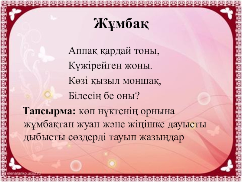 Тапсырма: көп нүктенің орнына жұмбақтан жуан және жіңішке дауысты дыбысты сөздерді тауып жазыңдар