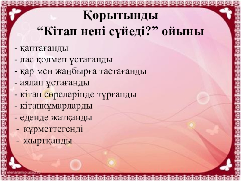 Қорытынды “Кітап нені сүйеді?” ойыны- қаптағанды- лас қолмен ұстағанды- қар мен жаңбырға тастағанды- аялап ұстағанды- кітап сөрелерінде