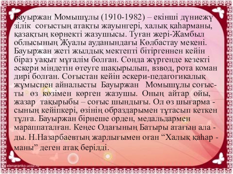 Кеңес Одағының батыры Бауыржан Момышұлы туралы мәлімет беру. Мәтін мазмұнын түсініп,
