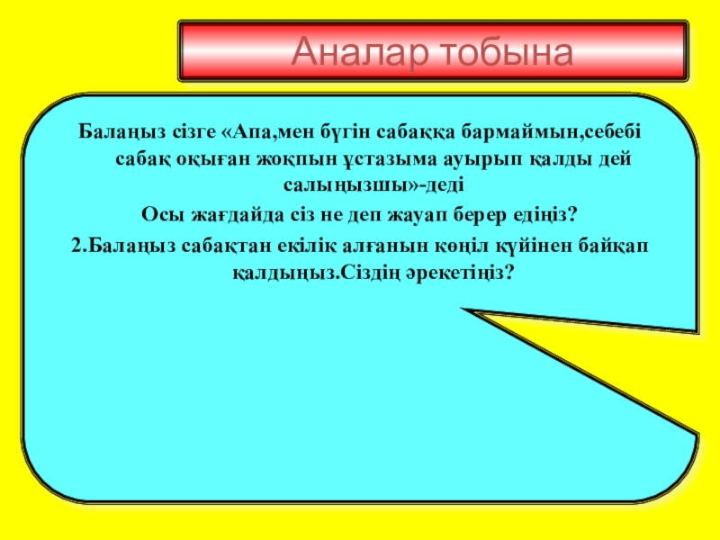Балаңыз сізге «Апа,мен бүгін сабаққа бармаймын,себебі сабақ оқыған жоқпын ұстазыма