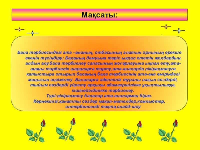 Бала тәрбиесіндегі ата –ананың, отбасының алатын орнының ерекше екенін түсіндіру;