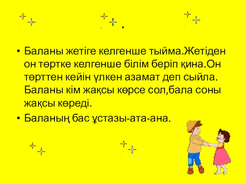 Баланы жетіге келгенше тыйма.Жетіден он төртке келгенше білім беріп қина.Он төрттен