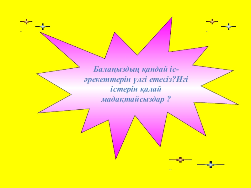 Слайд 22Балаңыздың қандай іс-әрекеттерін үлгі етесіз?Игі істерін қалай мадақтайсыздар ?