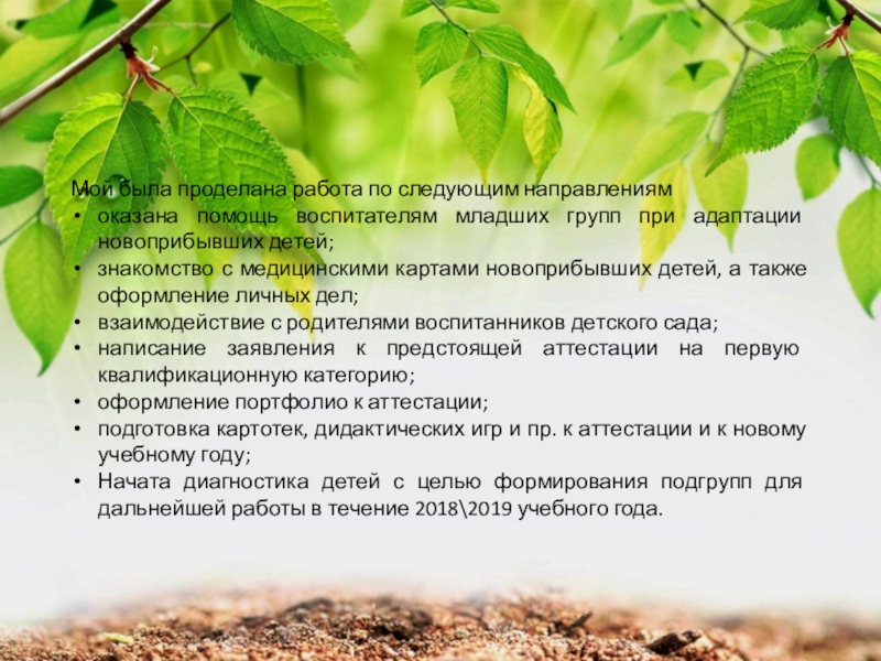 Мой была проделана работа по следующим направлениямоказана помощь воспитателям младших групп при адаптации новоприбывших детей;знакомство с медицинскими