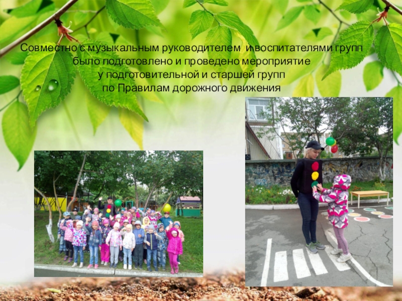 Совместно с музыкальным руководителем и воспитателями групп было подготовлено и проведено мероприятие у подготовительной и старшей групп по Правилам дорожного движения