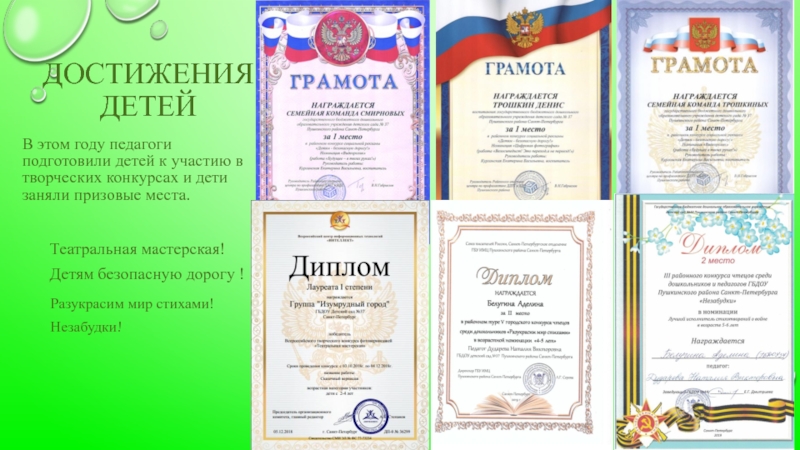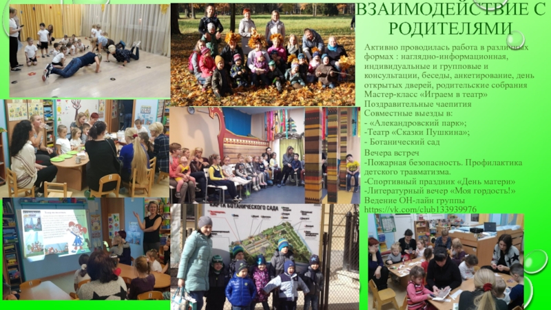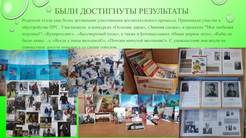 участие в обустройстве ПРС. Участвовали в конкурсах «Осенние дары», «Зимняя сказка», в проектах "Моя любимая игрушка!", «Буккроссинг» , «Бессмертный полк», а также в фотовыставках «Наше жаркое лето», «Кабы не было зимы…», «Когда у папы выходной!», «Почтим минутой молчания!». С удовольствие выезжали на совместные досуги знакомясь со своим городом.