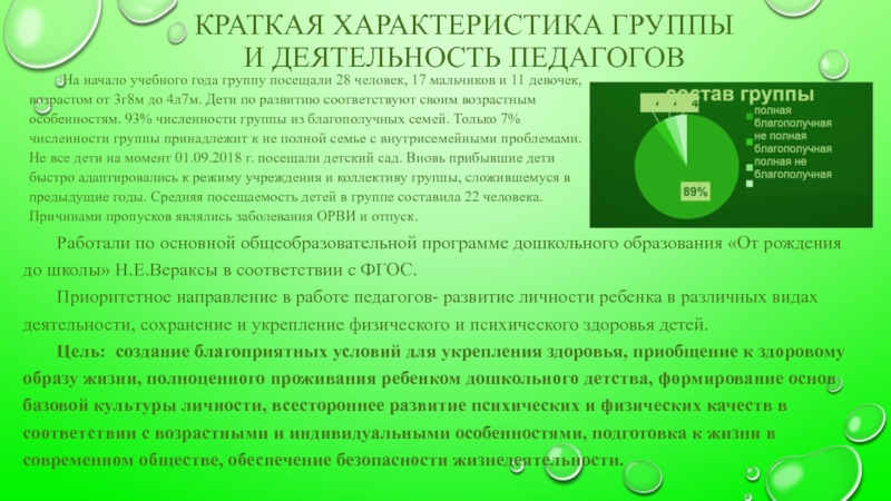 На начало учебного года группу посещали 28 человек, 17 мальчиков и 11 девочек, возрастом от 3г8м до 4л7м. Дети по развитию соответствуют своим возрастным особенностям. 93% численности группы из благополучных семей. Только 7% численности группы принадлежит к не полной семье с внутрисемейными проблемами. Не все дети на момент 01.09.2018 г. посещали детский сад. Вновь прибывшие дети быстро адаптировались к режиму учреждения и коллективу группы, сложившемуся в предыдущие годы. Средняя посещаемость детей в группе составила 22 человека. Причинами пропусков являлись заболевания ОРВИ и отпуск.