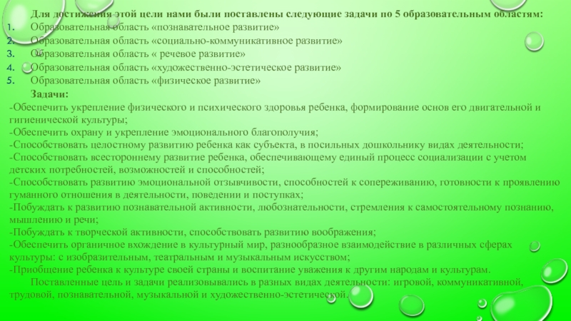Поставленные цель и задачи реализовывались в разных видах деятельности: игровой, коммуникативной, трудовой, познавательной, музыкальной и художественно-эстетической.