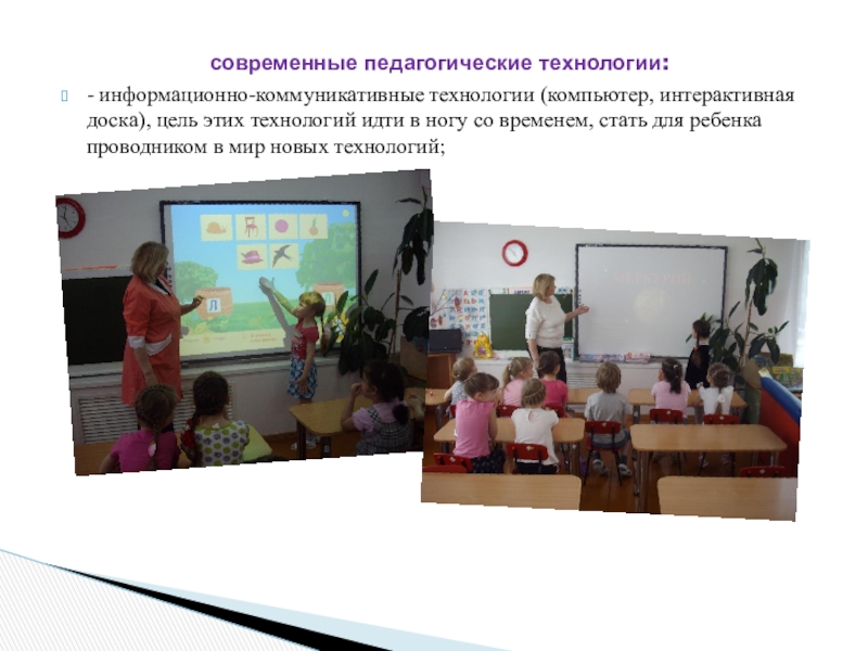 - информационно-коммуникативные технологии (компьютер, интерактивная доска), цель этих технологий